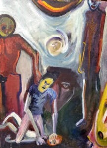 I called my sister. Yes, she heard him say it. Yes, she saw him step off the bus. She agreed he couldn’t win now. I hung up, relieved, sure we were right. Still pacing, I entered the spare room, where I kept my paintings. The series I titled “Monsters” was in the corner but close enough to reach. I picked up the rape picture and stared at the man’s face above mine, my neck and legs twisted in exaggeration. I’d tried painting and talking away the memory for 38 years with mixed results. Trump’s voice brought it back in vivid color.
